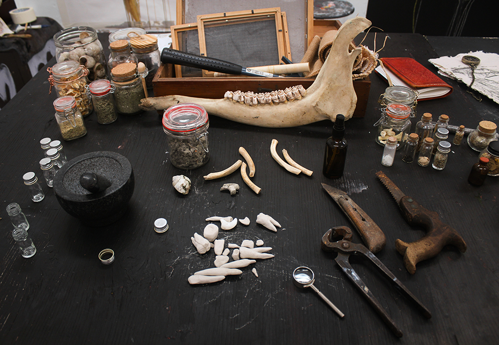 Found and created objects made of clay, wood, fabric, metal, leather, paper, glass, water colours